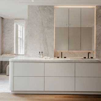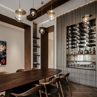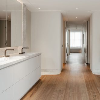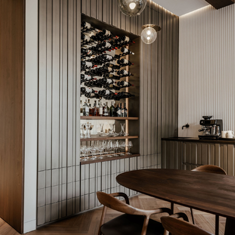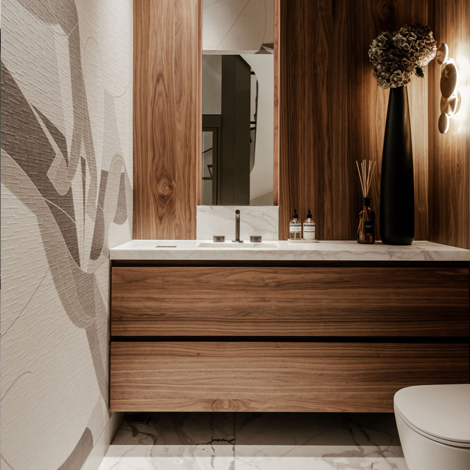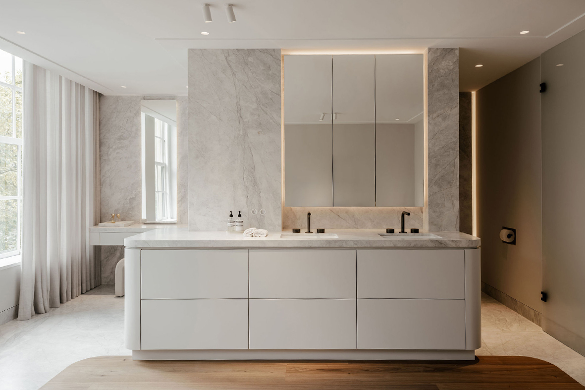 In dit project kwamen maatwerk en sfeer samen. De masterbadkamer is uitgevoerd in kleur gespoten MDF, terwijl de woonkamer wordt verrijkt met een unieke wijnkast met 3D-fronten en een speciale coating. Het toiletmeubel is uitgevoerd in warm Amerikaans noten, en de open inloopkast wordt subtiel verlicht met led-verlichting, wat een fijne en uitnodigende sfeer creƫert.